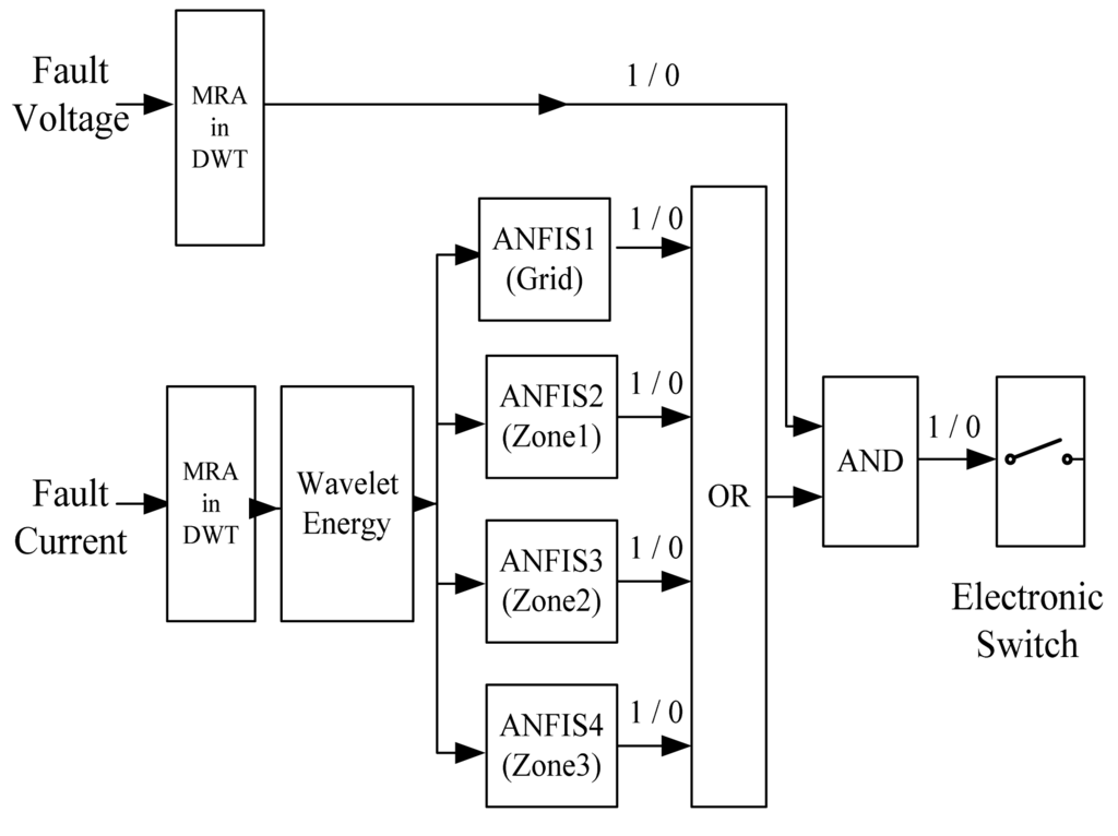 If the values of both logics are unities, then the electronic switch is activated to open the circuit. Figure 4 shows the overall architecture of these two logics. ANFIS1–ANFIS4 were trained individually with different data sets. For example, only the data sets related to the scenarios with faults occurring in Zone 1 were used to train ANFIS2. If identifying the fault locations is not needed, then only one ANFIS is required.