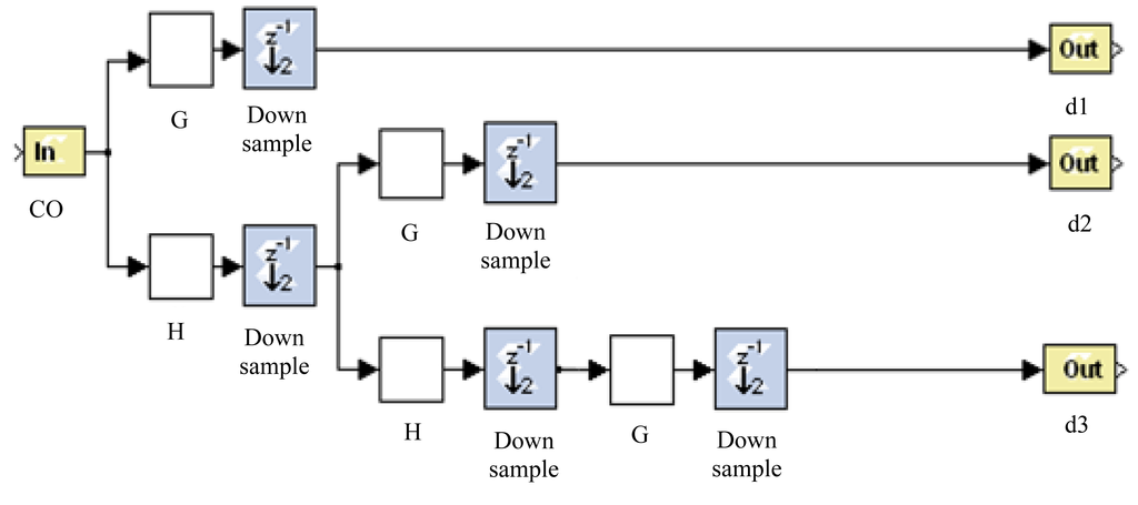 In this work, the Xilinx FPGA chip and the Xilinx System Generator (XSG) are used to implement the proposed method. The XSG toolbox can build a system model to be a hardware circuit in a Matlab/Simulink environment. Figure 5 illustrates how wavelet coefficients d1, d2 and d3 are calculated by wavelet high-pass (G) and low pass (H) filters as well as down sampling using the MRA of DWT in the XSG environment. The symbol “C0” denotes the original signal.