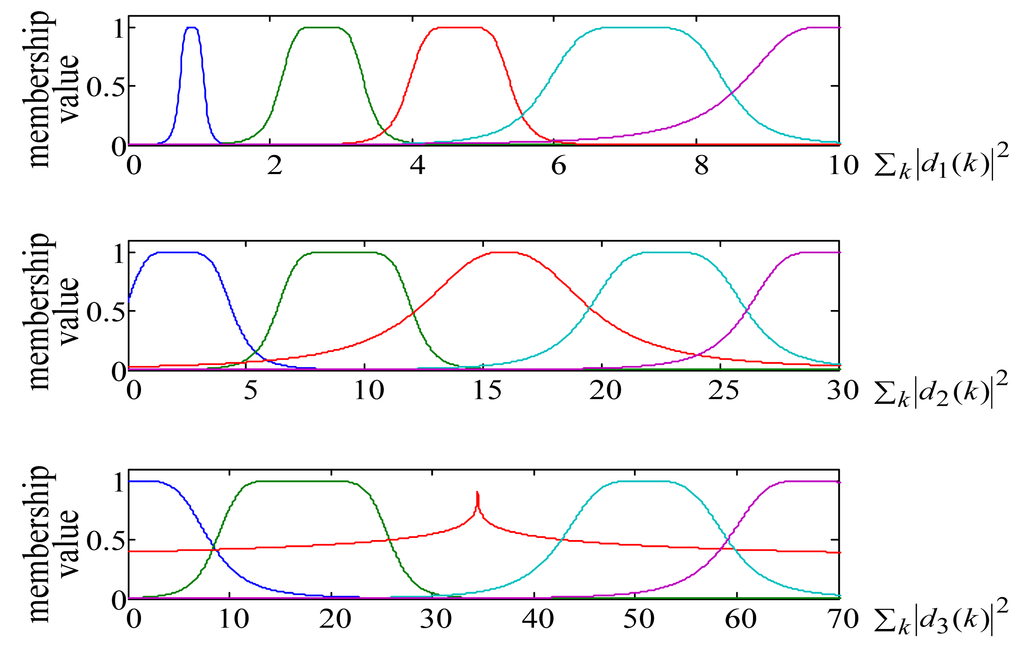 Unlike traditional methods in which multiple sensors are used in the power systems, the proposed method only uses the transient voltages and currents near the PCC. Figure 6 shows the obtained 15 corresponding membership functions.