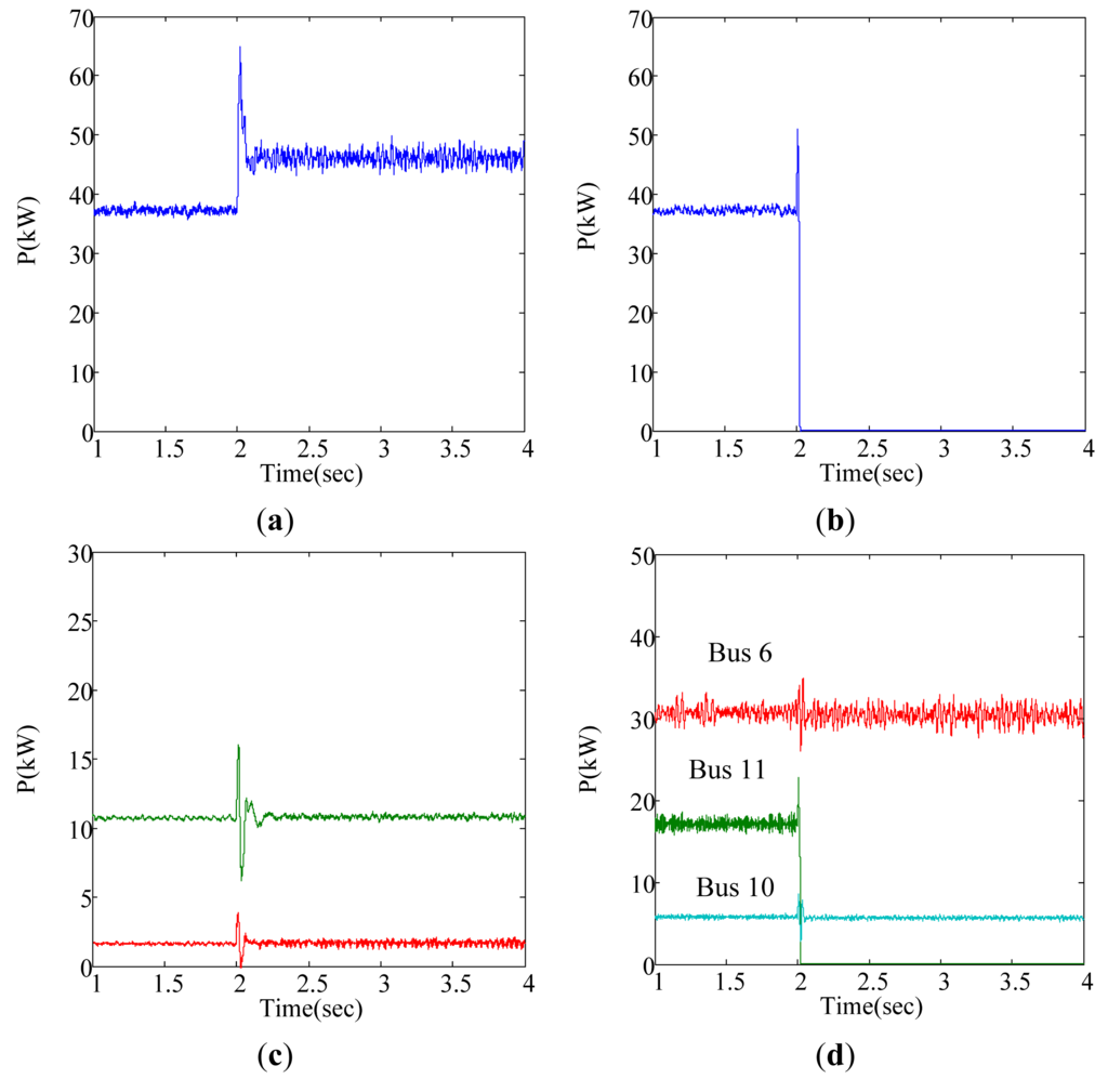 This subsection discusses a three-phase balanced fault occurring at Bus 4 at 2 s. Suppose that the wind speed, irradiation and system load are 8 m/s (corresponding to 11 and 1.5 kW from the two wind turbines at Bus 10), 600 W/m2 (corresponding to 17, 6 and 30 kW at Buses 6, 10 and 11) and 150 kW, respectively. After 1/4 of the cycle, the proposed method activates the static switch at PCC and the microgrid becomes islanded. Meanwhile, the following actions are carried out according to the assumptions described in Section 2: