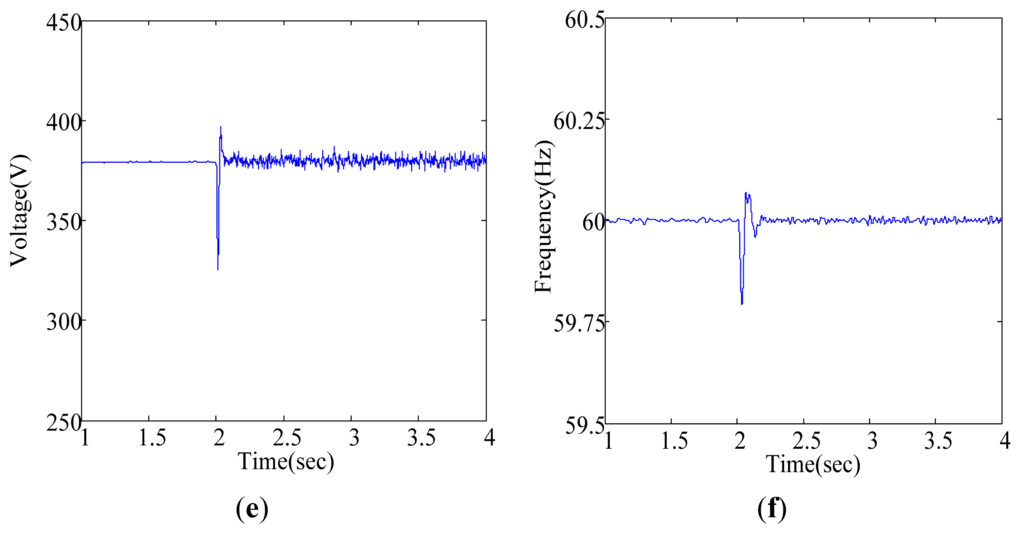 Figure 7 illustrates the system responses including kW generations for different distributed generations, voltage and frequency. The real power generation of a gas-turbine generator at Bus 5 (P/Q mode) becomes zero after disconnection. Bus 11 increases its generation from 37 kW (P/Q mode) to 45 kW (V/f mode). This figure reveals that the lowest voltage is close to 325 V (0.86 p.u.) and the lowest frequency is 59.8 Hz during the fault. Additionally, each DG is operated individually with the same real power generation before and after the fault in the steady state due to their P/Q mode except for the gas-turbine generator at bus 11 (for which the P/Q mode is switched to V/f mode).