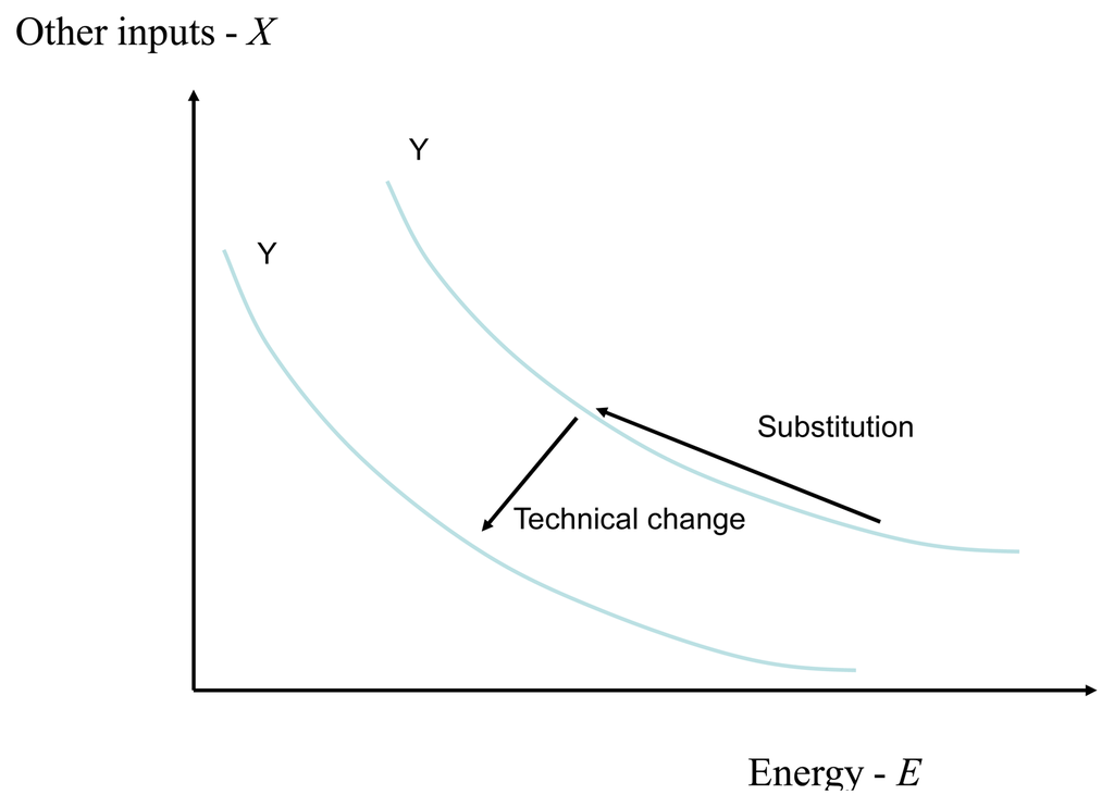 Substitution is conventionally represented as movement along an isoquant of a production or cost function and technical change as a shift of the isoquants (Figure 1). However, the distinction between the two is less clear from an engineering perspective and both may reflect a complex mix of investment, operational changes and shifts in the composition of output [13].