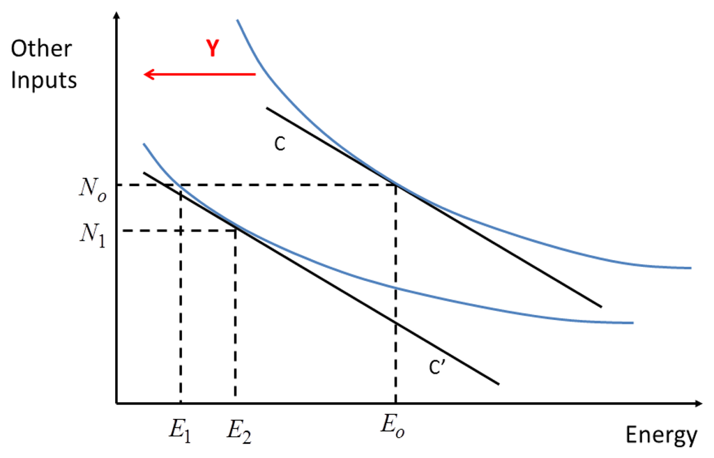 The contribution of substitution to the direct rebound effect may be illustrated graphically. For simplicity, we assume that non-energy inputs are “separable” from energy inputs and can therefore be grouped together, or “nested”. The meaning and implications of this assumption are described further below. Figure 2 shows a two-input conventional production function, where the optimal mix of energy (E) and a “nest” of other inputs (N) to produce output Y for an expenditure of C is given by the intersection of the isoquants with the iso-cost line (N0, E0). Energy-saving technical change shifts the isoquants to the left and changes their slope. If other inputs remain unchanged, the potential energy savings are E0 − E1. However, over time producers will shift to a new, lower cost input mix (N1, E2), leading to actual energy savings of E0 − E2 which are less than the potential savings. The size of the rebound effect ((E2 − E1)/(E0 − E1)) depends upon the ease of substitution between energy and other inputs—indicated by the curvature of the isoquant.