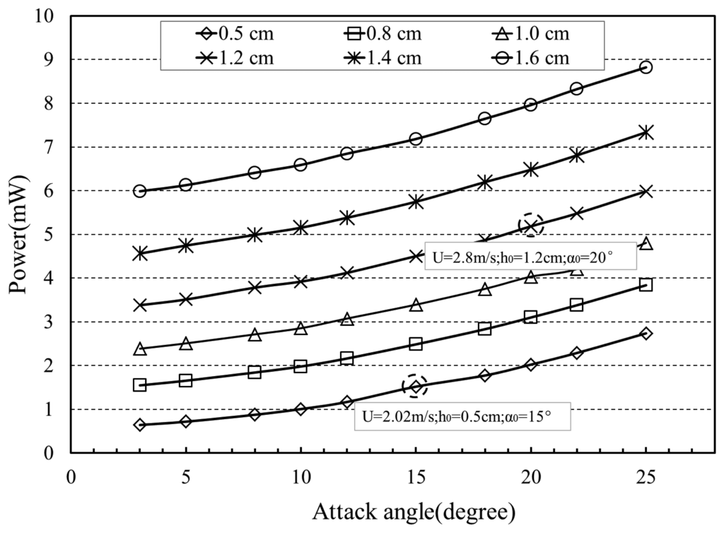 Once the airflow settled down, the vertical displacement and the angular displacement were imported into the Simulink model, so the output voltage across the 1 kΩ load resistance could be calculated (see Figure 10). Based on this load resistance and the corresponding voltage difference, the available output electrical power could be estimated as 1.62 mW (at 2.02 m/s, h0 = 0.5 cm, α0 = 15°) and 5.12 mW (at 2.80 m/s, h0 = 1.2 cm, α0 = 20°). These simulation results were validated against our experimental data (see Figure 11) as shown in Table 3. From the comparison between experimental and simulation data, we find that the experimental data is about 20% higher than the simulation results. This difference can be attributed to the simplification of our simulation model, i.e., we only introduced the upward and downward lift force into the electromagnetic model without considering the torsional moments, which could contribute additional mechanical energy input into the energy conversion system. However, the simulation results do reflect the trend and order-of-magnitude of the input-output relationship of the system, and could be used as a reference for next-generation designs with different amplitudes and attack angles.