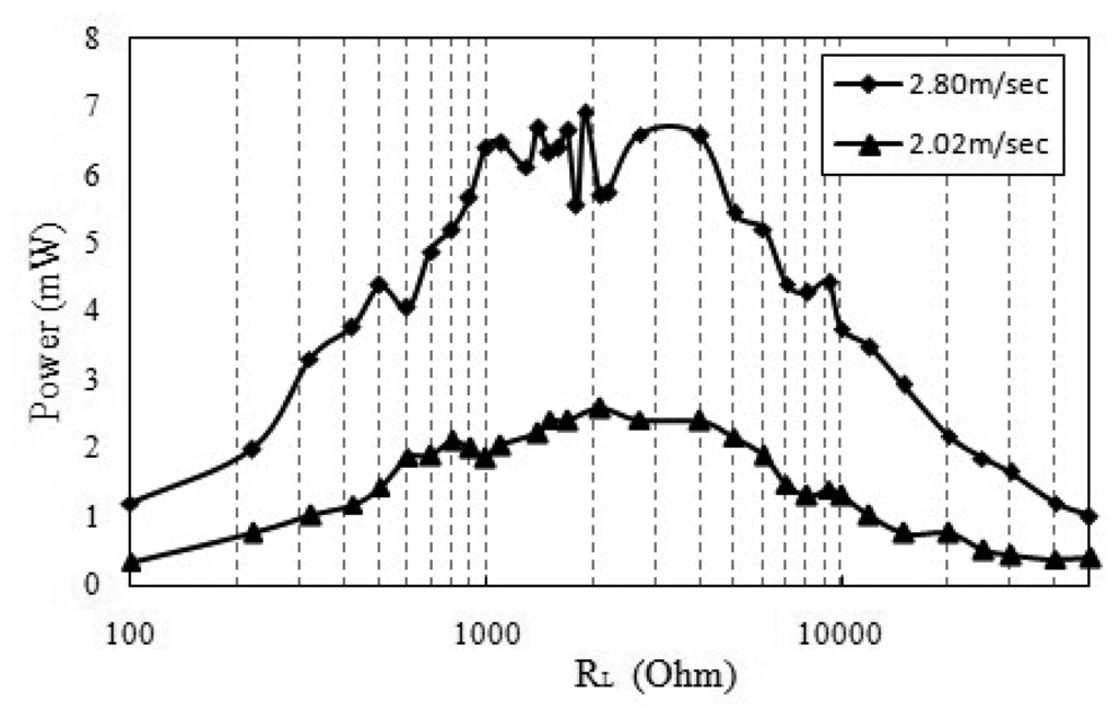 Our system described in this paper is composed of two parts: (1) a flutter belt to transform the airflow into vibration energy, and (2) the electromagnetic resonator to convert the vibrations into electrical energy. The design rules of electromagnetic generator have been discussed by others already (e.g., see Roundy [] and Beeby, et al. []). The potential power harvesting capabilities for typical ambient energy sources is provided as follows. Ambient light could provide a power density of ∼100mW/cm2 for a device directed towards bright sunlight, and ∼100 μW/cm2 for a device illuminated by office light. The power density of thermoelectric device is about 60 μW/cm2; the power density of vibration source is from 4 μW/cm3 (human motions) to 800 μW/cm3 (machines) []. The volume of the core of our electromagnetic resonator (as shown in Figure 8) is about 15 cm3, which could provide nearly 7 mW of electrical power according to Figure 11. Hence, the output power density of our system described in this paper is about 445 μW/cm3.