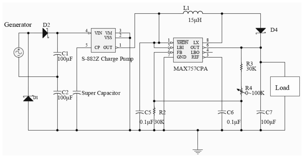 Power management is an important issue associated with most ambient energy harvesting technologies. If the system is a battery powered system, the current and voltage are stable and can be anticipated, so the power management circuit seeks mainly to extend the lifetime of the battery. In the case of an energy harvesting technology, most ambient sources are unable in providing high enough current or voltage for synchronous power consumption, so the strategy is based on “duty-cycle” work principle, which means accumulating energy in a temporary energy buffer to enable utilization as bursts over short periods. Thus the main functions of an ambient energy harvesting power management circuit include amplifying the voltage generated, storing and releasing buffered energy, and regulating the voltage to satisfy the requirements of electronic devices served. Figure 12 schematically illustrates the power management circuits used in our indoor airflow energy harvesting devices. The important parts of this circuit system are described below.