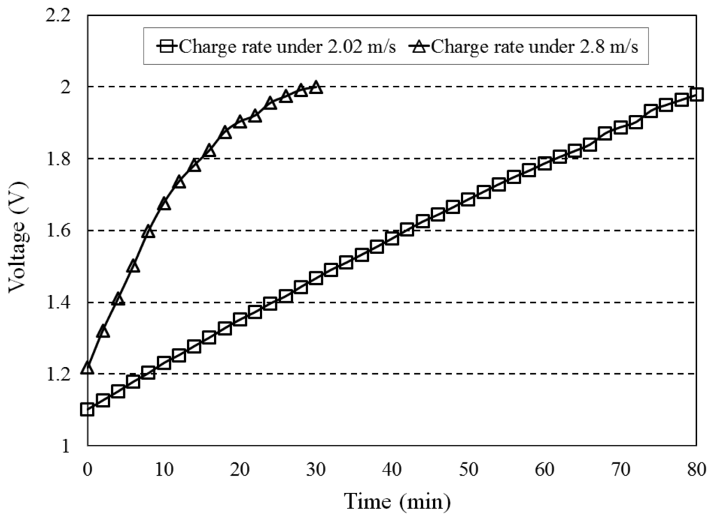 In many office buildings, the airflow speed in the ducts is limited to less than 5 m/s. For instance, the size of the air return duct in our office is 0.5 m × 0.5 m and only gives a maxium airflow speed of ∼3 m/s, which limits the power output for the indoor airflow energy harvesting system. As shown in Figure 13, when the output power of the system is used to charge a 1 F super capacitor directly, it takes nearly 30 min to charge a super capacitor to2.0 V under the airflow speed of 2.8 m/s. When the airflow speed drops to 2.02 m/s, it will take more than 80 min to charge up the super capacitor.