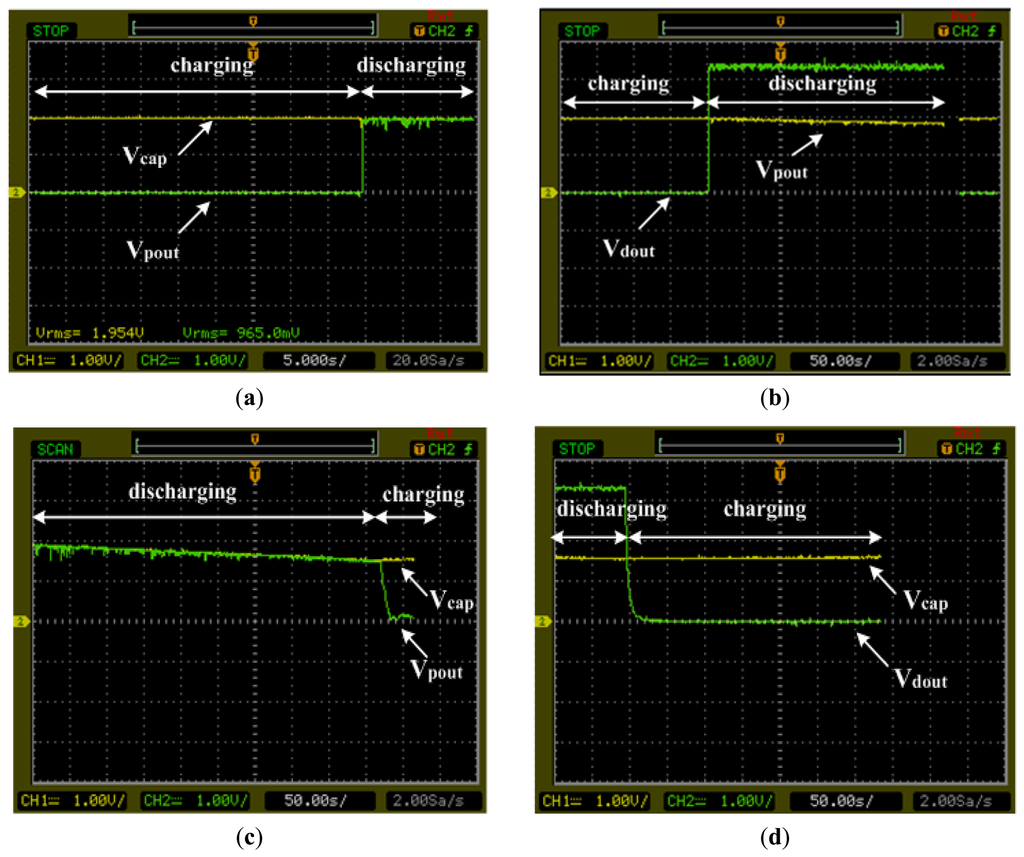 Figure 14 shows the operating process flow of the power management circuit. When the voltage of the super capacitor Vcap reaches 2.0 V, the output of the charge pump (Model S-852Z, Seiko Instruments Inc., Chiba, Japan) connects to the super capacitor and begins discharging, as shown in Figure 14a. The output voltage of the charge pump, Vpout, always stays at zero during the charging step. No current leakage means that there is no energy loss during the charging process. In addition, when the input of the DC–DC converter (Model MAX757, Maxim Integrated, San Jose, CA, USA) detects a high voltage at the output port of the charge pump, the converter starts working and it changes the output voltage Vdout from 0 V to 3.3 V (see Figure 14b). The voltage across the super capacitor Vcap decreases slowly as the load consumes electrical energy. When Vcap drops to 1.5 V, the discharge process ends, the output voltage of the charge pump falls back to 1.2 V and the DC–DC converter stops working. Then another charging cycle is initiated, as shown in Figure 14c,d.
