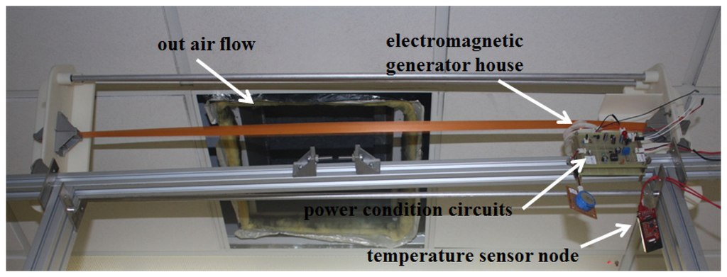 Wireless sensor networks (WSNs) have been widely used for intelligent building management applications. Typically, indoor environment parameters such as illumination, temperature, humidity and air quality are monitored and adjusted by an intelligent building management system. However, owing to the short life-span of the batteries used at the sensor nodes, the maintenance of such systems has been labor-intensive and time-consuming. This paper discusses a battery-less self-powering system that converts the mechanical energy from the airflow in ventilation ducts into electrical energy. The system uses a flutter energy conversion device (FECD) capable of working at low airflow speeds while installed on the ventilation ducts inside of buildings. A power management strategy implemented with a circuit system ensures sufficient power for driving commercial electronic devices. For instance, the power management circuit is capable of charging a 1 F super capacitor to 2 V under ventilation duct airflow speeds of less than 3 m/s.1. Introduction