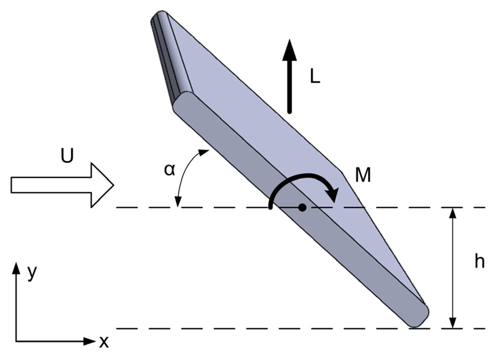 Figure 3 illustrates the aerodynamic forces contributing to flutter: a vertical lift force, L, as well as a pitching moment, M, are induced by the interaction between airflow, U, and oscillations in the structure. The fluid-structure interaction which results in the flutter motion can be represented as: