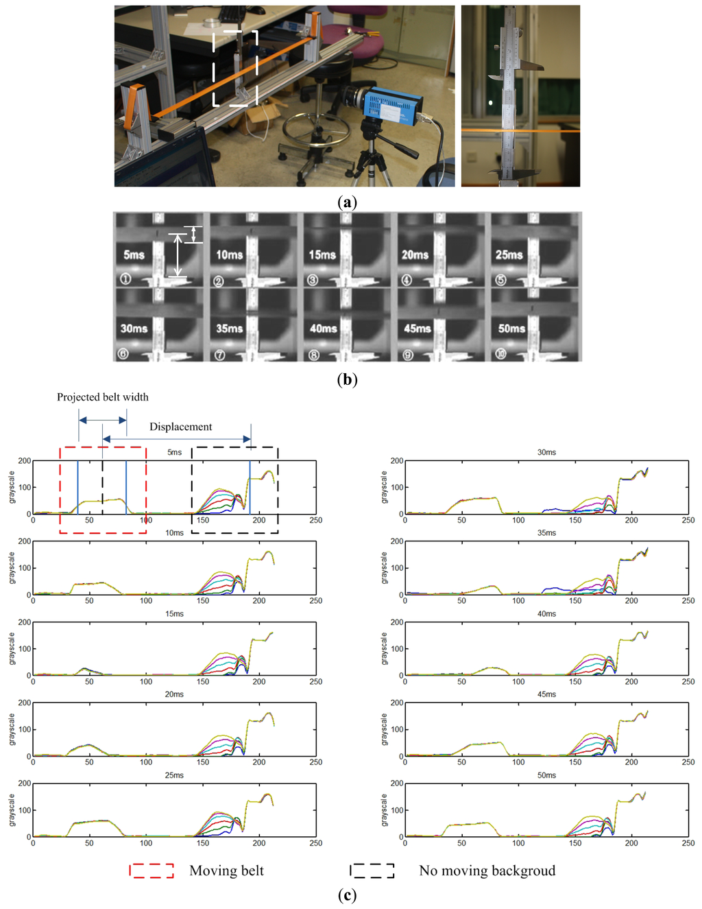 To analyze the vibration amplitude and frequency of the fluttering belt, a high speed camera (PCO 1200S, PCO AG, Kelheim, Germany) image-capturing system was used to measure its vertical displacement h and angle displacement α (see Figure 4a). The high speed camera captured a series of pictures at 5 ms intervals when the belt oscillates. The displacement and pitch angle of the fluttering belt could thus be measured by comparing the states of these pictures (see Figure 4b,c). Note that the maximum angle of attack and displacement will be different when an EMG resonator is loaded.