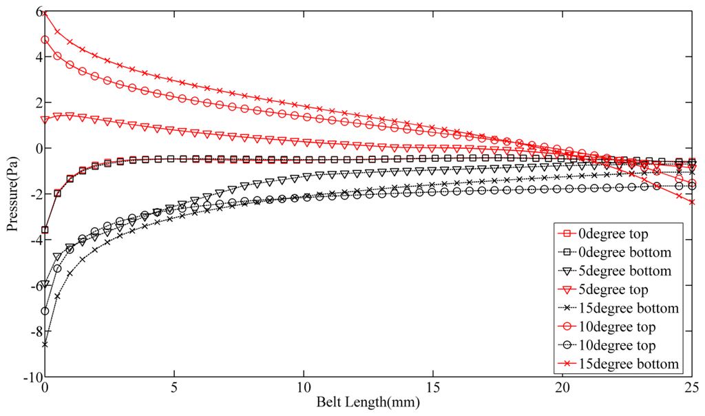 The dependent variables for this solution domain include pressure p and the fluid particle velocity vector u = {u,v,w}T, where x, y and z are the Cartesian directions. To simplify the problem, the fluid flow is assumed to be laminar and Newtonian, and the constant air density ρ is 1.225 kg/m3. We have conduted 2D simulations by using COMSOL Multiphysics to determine the aerodynamic parameters around the belt during the flutter process. The belt width was set at 25 mm, corresponding to the experiments. The belt's attack angle was varied to visualize the 2D idealized flow and pressure distribution. When the airflow speed was 2.8 m/s and the attack angle was 0°, the laminar flow was lightly disturbed while passing through the belt (see Figure 6a which shows the velocity field around the flexible belt). When the attack angle was increased to 15°, turbulent flow appears, and the flow velocity around the top layer becomes less than that at the bottom layer (see Figure 6b). The pressure difference also increased between the top and bottom layers, which resulted in torsion and lift forces, as observed during experiments. Figure 7 shows further details concerning the pressure difference arising when the attack angle was varied from 0° to 15°.