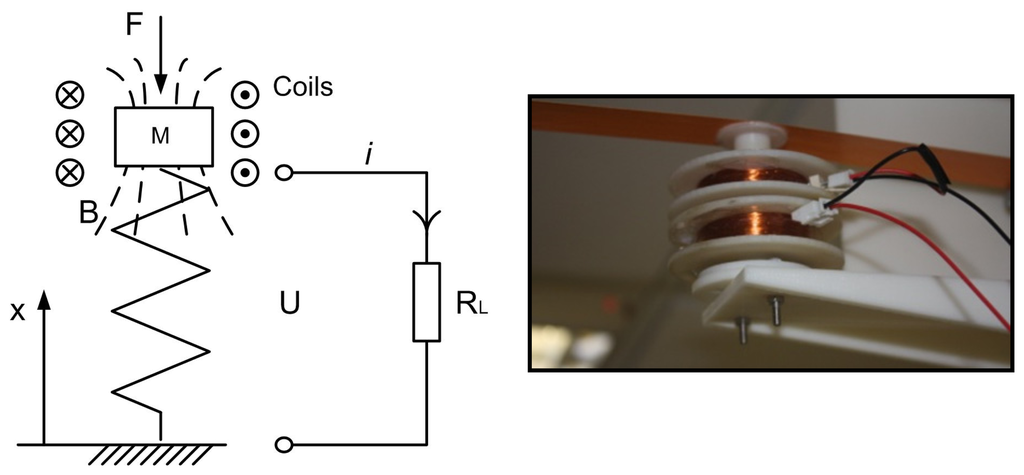 An electromagnetic generator (EMG) model using static coils is illustrated in Figure 8. In contrast to the electromagnetic resonator with moving coils [], the permanent magnet attached to a spring is excited by the external force F. The motion of the mass induces a voltage, V, in the coils and provides electric power to the load, RL. The total force on the magnetic mass includes: