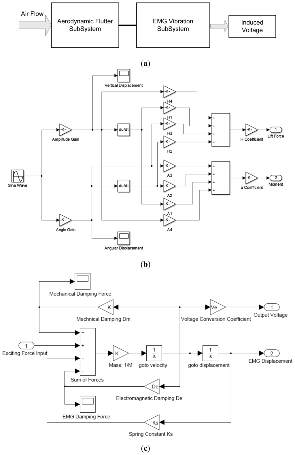 Following the availability of the flutter belt model and the linear EMG model, the entire energy harvesting system could be simulated using MATLAB® Simulink (Math Works Inc., Natick, MA, USA), as illustrated in Figure 9. From the aerodynamic flutter equations, it was evident that the performance of the entire energy harvesting system is dominated by the magnitude of the airflow velocity.