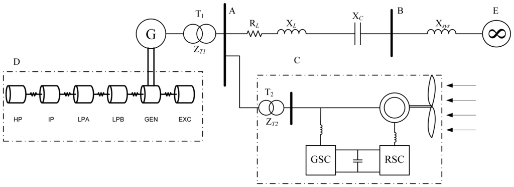 To evaluate the effectiveness of the proposed strategy on auxiliary damping control, the well-known IEEE first benchmark model, modified by the inclusion of DFIG-based wind farms, is used (Figure 1). The system consists of an 892.4 MWA turbogenerator connected to an infinite bus through a radial series-compensated line. The rated voltage is 539 kV, and the frequency is 60 Hz. A DFIG-based wind farm (200 MW from the aggregation of 2 MW units) is connected to bus A via a transformer. Figure 1 shows that G represents the turbogenerators; C, the DFIG-based wind farms; D, the turbine shaft system; and E, the infinite power grid. RL + jXL is the power transmission line impedance, Xc is the captance of the series compensation capacitor, and Xsys is the reactance of the transmission line to the infinite power grid. The complete electrical and mechanical data are given in the Appendix.