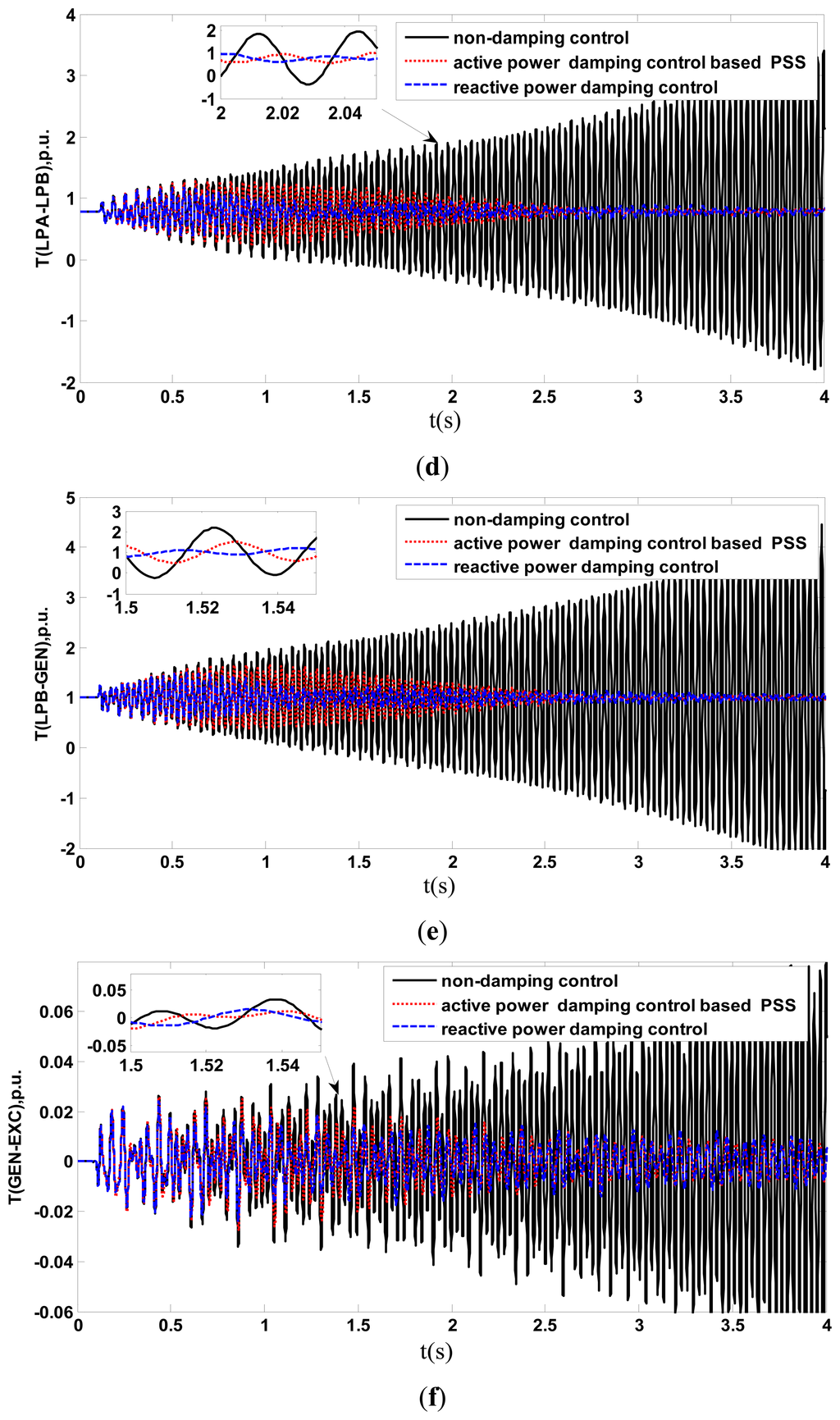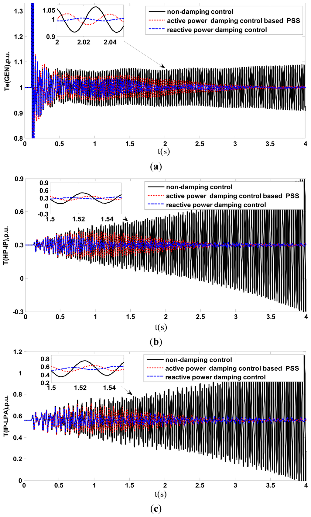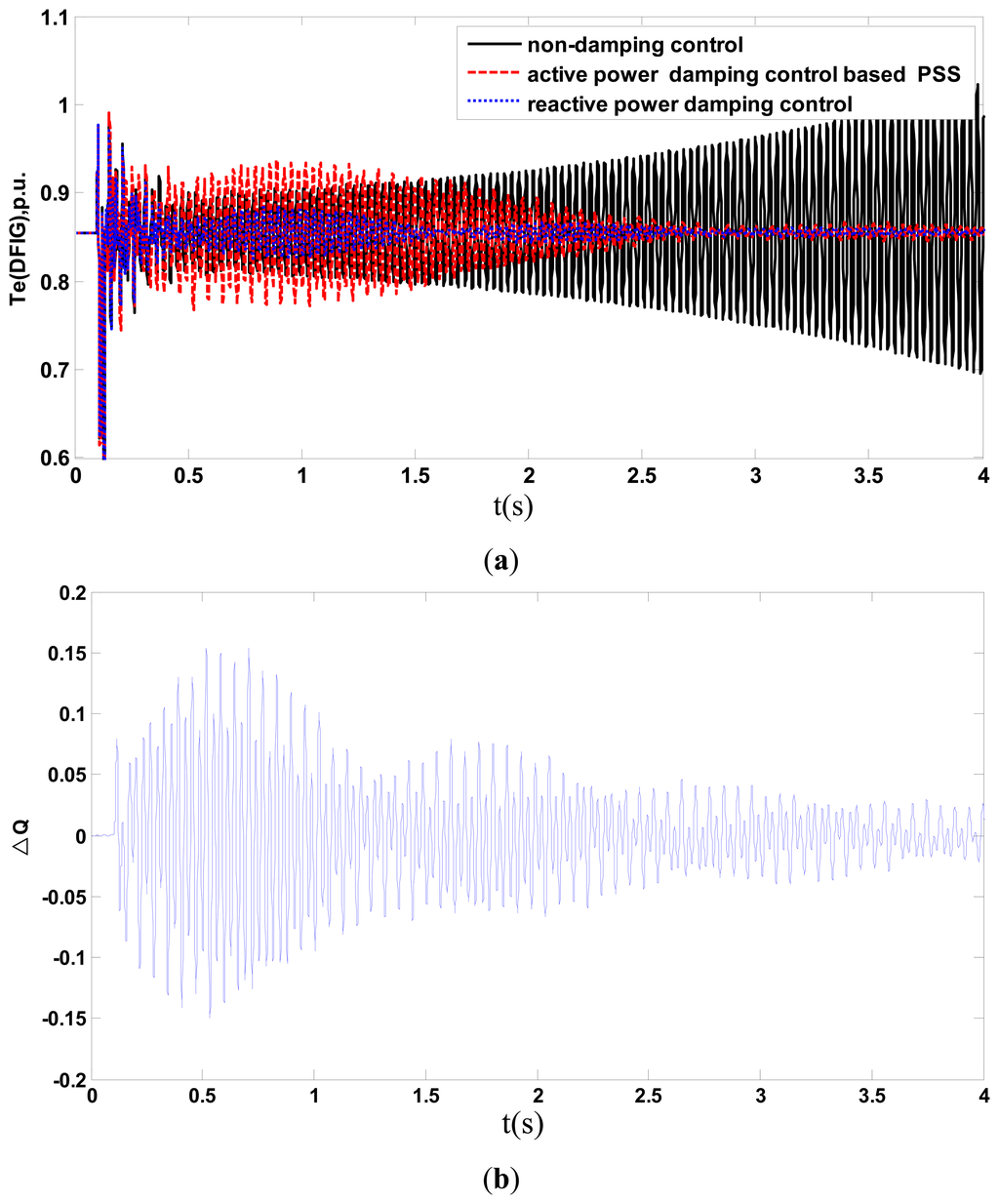 Figure 9 shows that when the auxiliary damping control of DFIG is not in service, the turbogenerator shaft electrical torque, torsional torque, and angular acceleration exhibit severe torsional amplifications (instability) after clearing faults. When the auxiliary damping control of DFIG is in service, the turbogenerator shaft electrical torque, torsional torque, and angular acceleration are stable. Meanwhile, compared with the active power addition damping control based with PSS, the auxiliary damping control based on reactive power exhibit samller torque fluctuation. These results demonstrate the effectiveness of the proposed auxiliary damping control in damping the SSR and was superior to active power addition damping control based with PSS. Figure 10a also shows that the adverse effect of SSR is extended to DFIG when the auxiliary damping control of DFIG is not in service and the DFIG electrical torques also exhibit severe torsional amplifications (instability). When the auxiliary damping control of DFIG is in service, a supplementary signal output of dynamic reactive power ΔQ is added at the reactive power loop of RSC, as shown in Figure 10b. The DFIG electrical torque is stable.