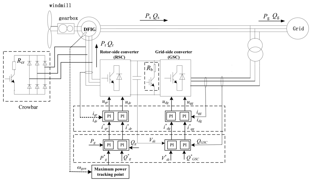 The typical DFIG configuration consists of a wound rotor induction generator, with the stator directly connected to the grid and the rotor interfaced through a back-to-back partial scale power converter, as shown in Figure 2. The back-to-back converter is a bi-directional power converter that consists of two conventional voltage source converters (an RSC and a grid side converter or GSC) and a common dc-bus. Both GSC and RSC contain an internal current controller and an external power controller. The slow power controller provides a reference current to the fast current controller, which further regulates the rotor current to the reference value. The RSC aims to independently control the active power of the generator and the reactive power produced or absorbed from the grid. The GSC aims to keep the dc-link voltage constant, regardless of the magnitude and direction of the rotor power and to guarantee converter operation with unity power factor (zero reactive power). This requirement means that the GSC exchanges only active power with the grid, so the transmission of reactive power from the DFIG to the grid is done only through the stator [18,19].