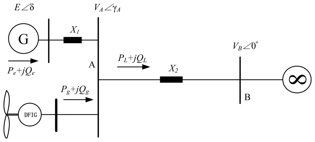 To analyze the mechanism of influence of the DFIG-based wind farms on system SSR damping, the system model in Figure 1 is simplified in Figure 3, where E is the quadrature-axis transient electromotive force of turbogenerator G; VA is the voltage of bus A; VB is the infinite bus voltage; δ, γA is the phase angle difference between E, VA, and VB; Pe, Qe are the active/reactive power output of the turbogenerator; Pg, Qg are the active/reactive power output of the DFIG-based wind farms; PL, QL are the active/reactive power flow through the transmission line; and X1, X2 are the reactance parameters.