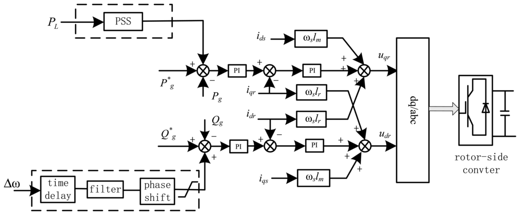 The diagram of the auxiliary damping control system is shown in Figure 4. SSR damping is achieved by addition of a supplementary signal at the reactive power loop of the RSC. Turbogenerator speed Δω served as the input signal; after processing by time delay, filter, and phase shift, a supplementary signal output of dynamic reactive power ΔQg was provided and added at the reactive power loop of RSC. Also, the method of utilizing power system stabilizer (PSS) added at the active power loop of the RSC is shown in Figure 4 [22,23], where Pg and Qg are the measured values of active/reactive power from the output ends of wind farms; P*g, Q*g are the set values of the active/reactive power of the converters, respectively; idr, iqr are the rotor current values of Shaft d and Shaft q; ids, iqs are the stator current values of Shaft d and Shaft q; udr, uqr are the rotor voltages of Shaft d and Shaft q; lr, lm are the rotor self-inductance and stator mutual inductance; and ωs is the slip angular frequency.