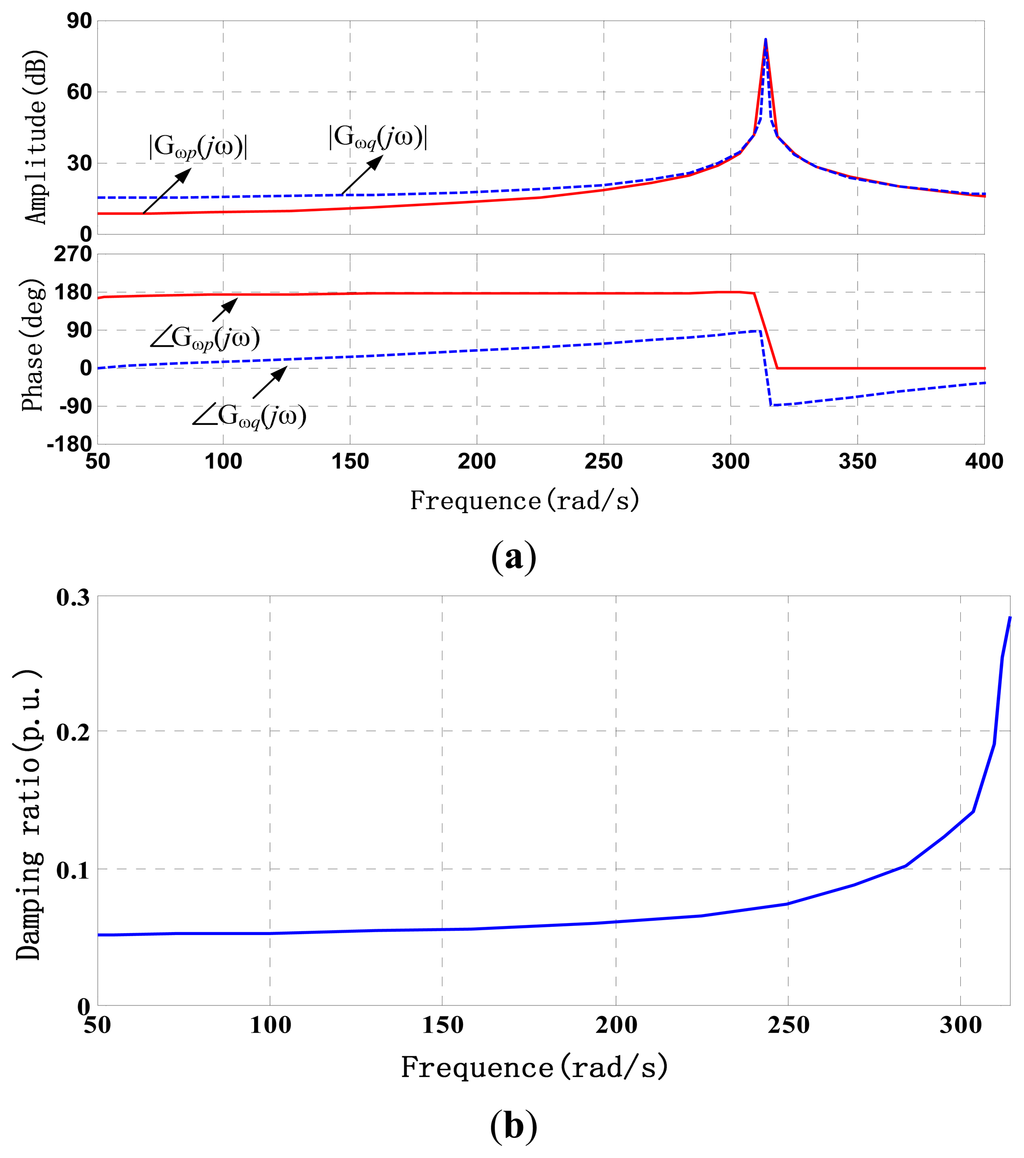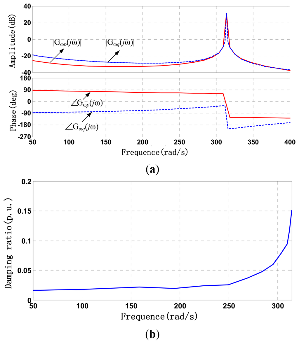 Meanwhile, from Figure 8a we can also see that the log amplitude of Gωp(jω) is smaller than the Gωq(jω) in entire subsynchronous frequency band. This would also mean that |Gωp(jω)| will be much samller than |Gωq(jω)|, and the reactive power significantly affect the system damping more than active power.