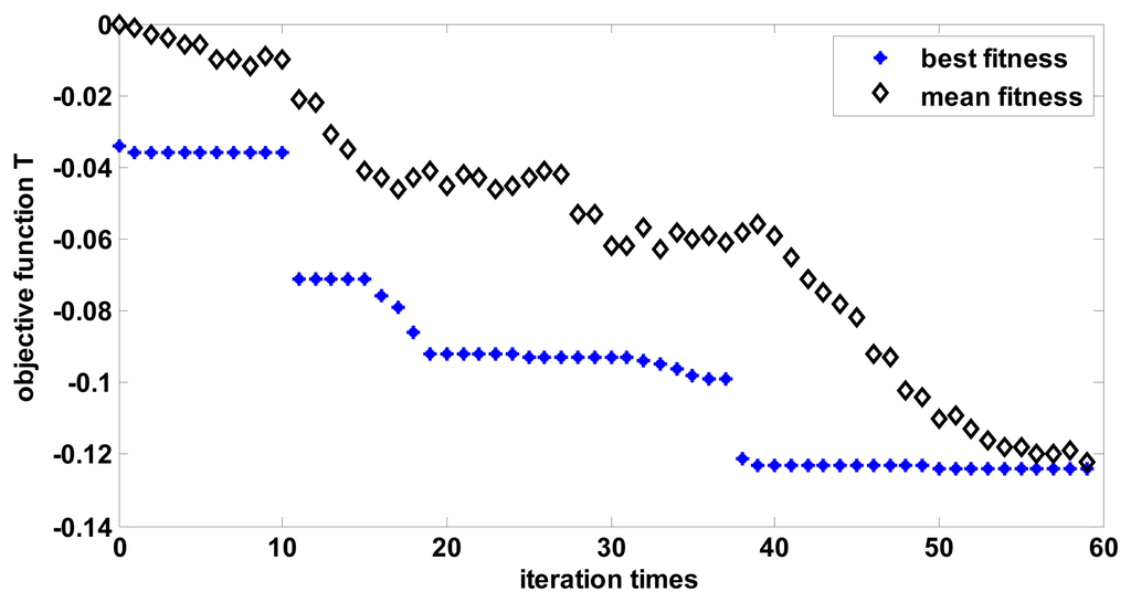 In the figure, N1 is the total number of iterations in the optimization. The value range of PID parameters and compensation level are set as: KP∈(0.1,10), TI∈(1,100), TD∈(1,100), XC/XL∈(0.2,0.8). According to the above calculation process for the optimization of the phase compensation parameters of the PID controller, the changes in best fitness and mean fitness are shown in Figure 7.