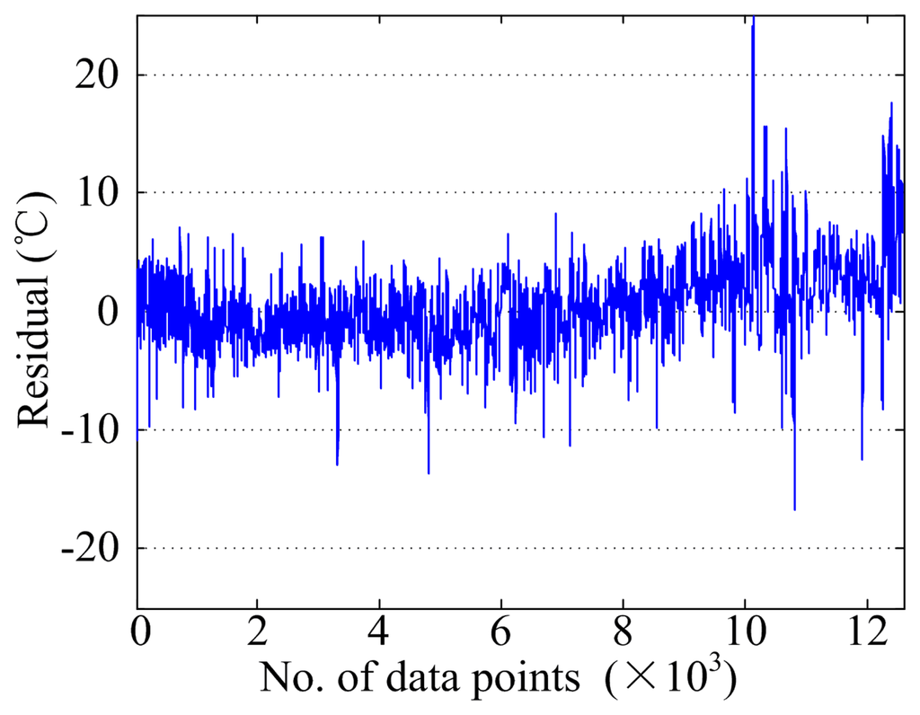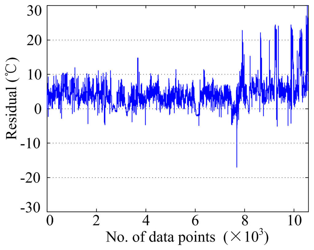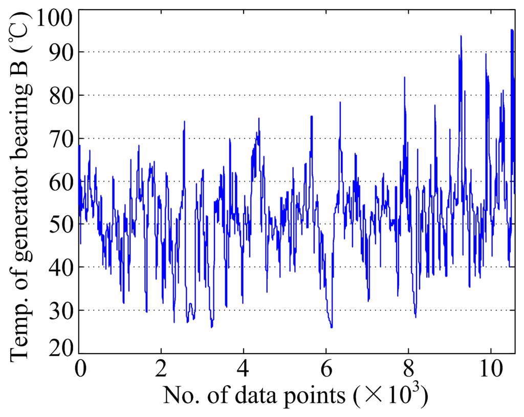 According to field records, the SCADA data of approximately 12,600 data points for three months before the failure of the generator bearing of WT 17 were selected. By building the model of the temperature of generator bearing B, the residual between the model result and the actual value was calculated by time sequence, as shown in Figure 10. From the beginning to around the 10,000th data point, residuals distributed approximately between −5 and 5 °C, and generator bearing B was in a normal condition. At about the 10,000th data point, the residual increased rapidly, up to 25 °C and decreased to −17 °C around the 10,810th data point. It became smaller during a short interval after the 10,810th data point, and turned into a great change of magnitude between −13 °C and 18 °C near the 12,000th data point.
