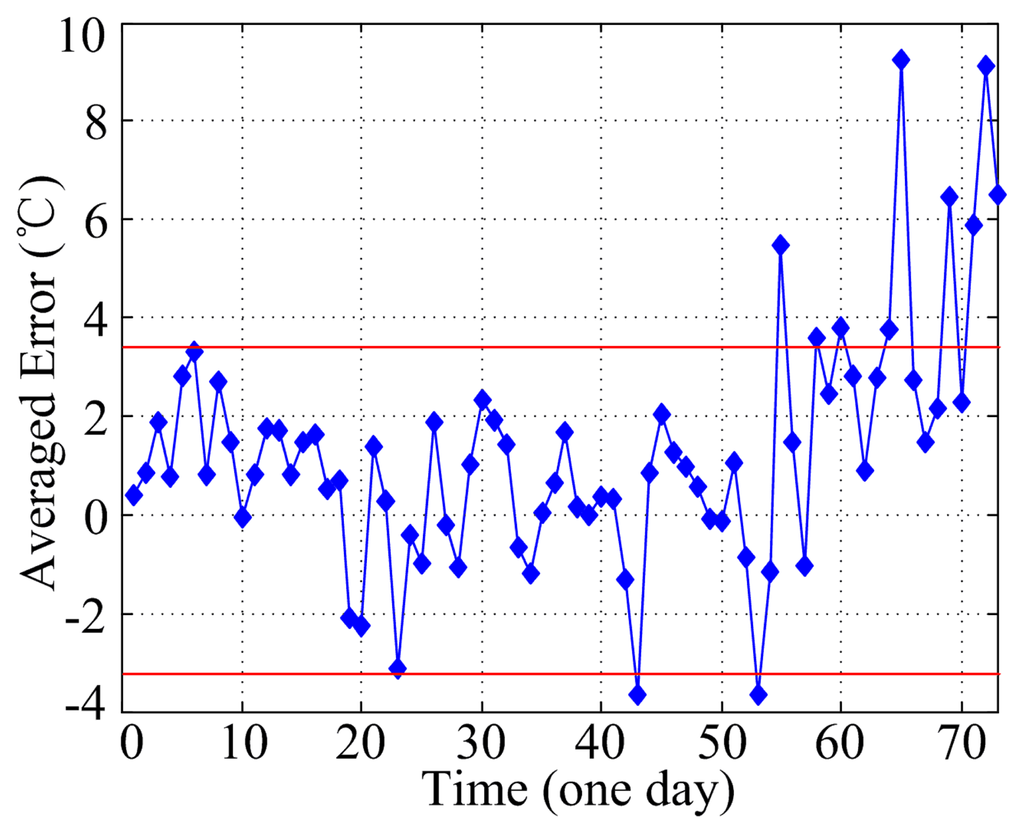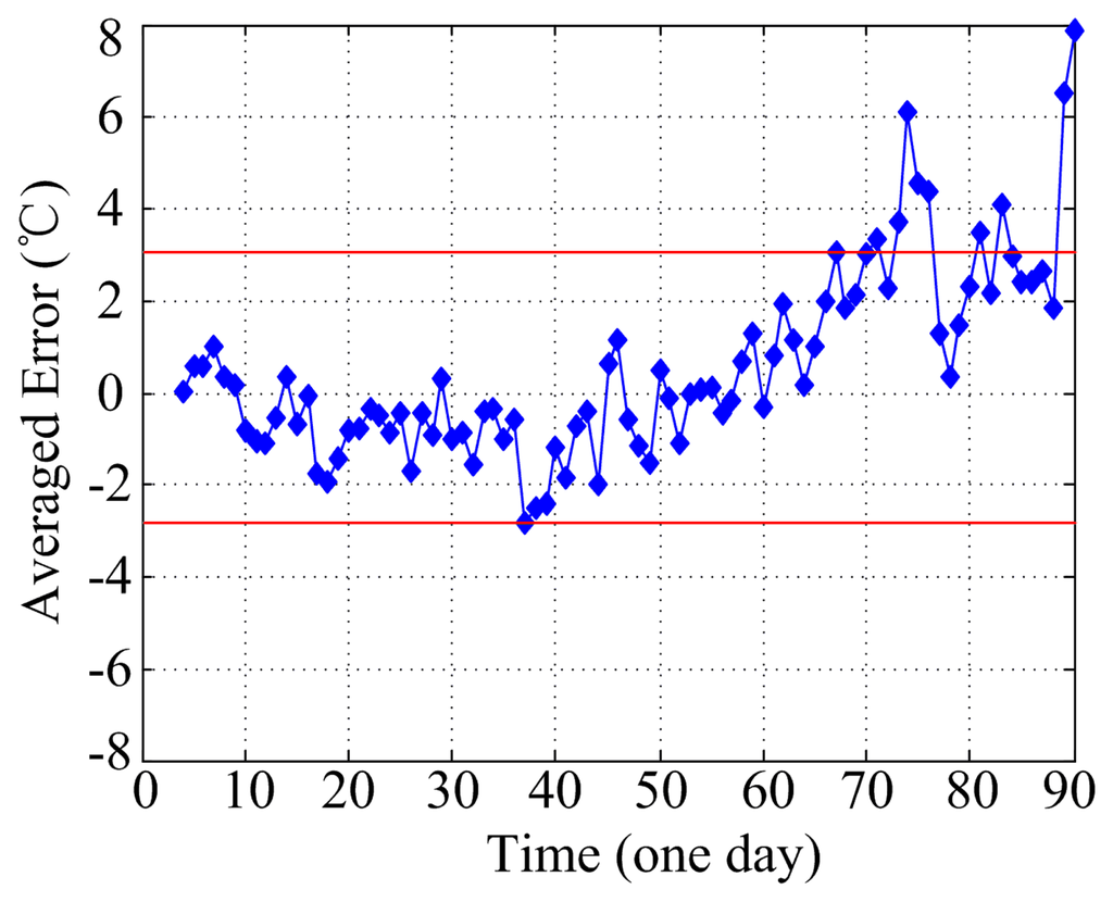 According to Figure 10, data points with the absolute value of the residual greater than 5 °C were less. In the normal condition, data points with the absolute value of the residual greater than 10 °C were observed; thus, identifying the outlier or the disturbance was difficult. Statistics on the average residual per day were recorded, as shown in Figure 11. From the beginning to the 70th day, the average residual error changed slightly, and was mainly distributed between −4 and 4 °C. On the 75th day, the average residual error reached 6 °C. This value became smaller later, until finally, it rapidly reached the maximum value before failure occurred. In Figure 11, during the normal condition of WTs, the average residual fluctuated up and down at 0 °C, with a smaller change in amplitude. Compared with Figure 10, the disturbance could be effectively eliminated by computing the daily average residual value. However, before the failure occurred, the average residual amplitude reached 6 °C and exhibited no significant difference with the average residual during the normal condition. Such result is not conducive to judging the abnormal condition.