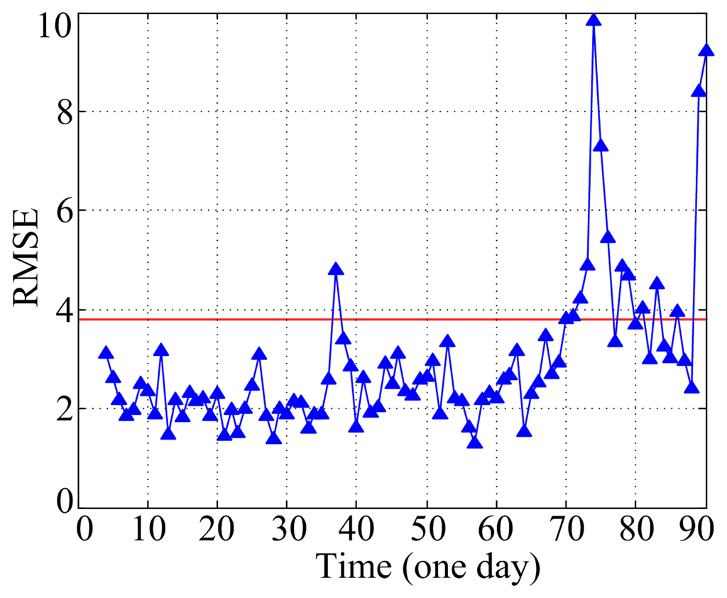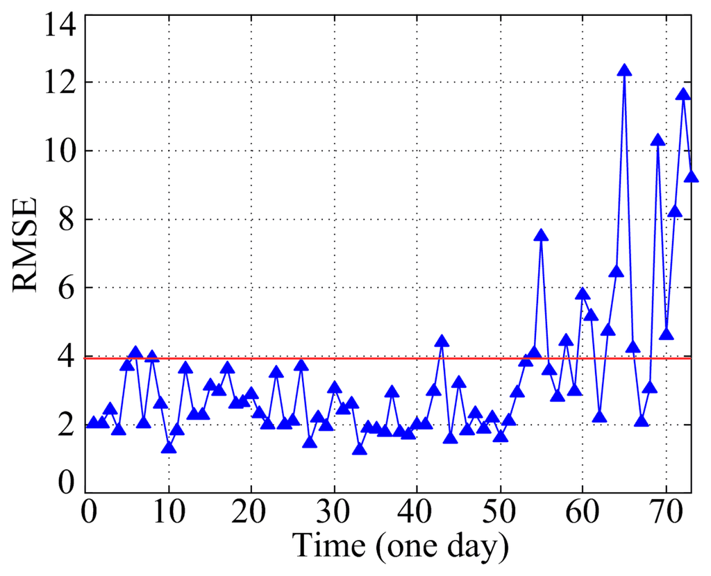 Figure 12 shows the changing trend of the RMSE on a daily basis. From the 1st to the 70th day, the RMSE amplitude during normal operation was less than 4. It nearly reached 10 on the 75th day, then dropped to around 4, and increased rapidly one or two days before the fault occurred. As shown in Figure 12, the RMSE on the 75th day and before the fault occurred was significantly greater than that in the normal condition. Compared with the average residual, the RMSE better distinguished between the normal condition and the degradation condition of the temperature parameter of generator bearing B. It efficiently identified the initial stage of parameter degradation. Therefore, the RMSE can identify the abnormal condition of the temperature parameter of generator bearing B and is conducive to providing early warning for generator bearing B. Moreover, 15 days before the fault occurred (about the 75th day), the model exhibited a large RMSE amplitude, which provided a premise for determining the fault alarm time.