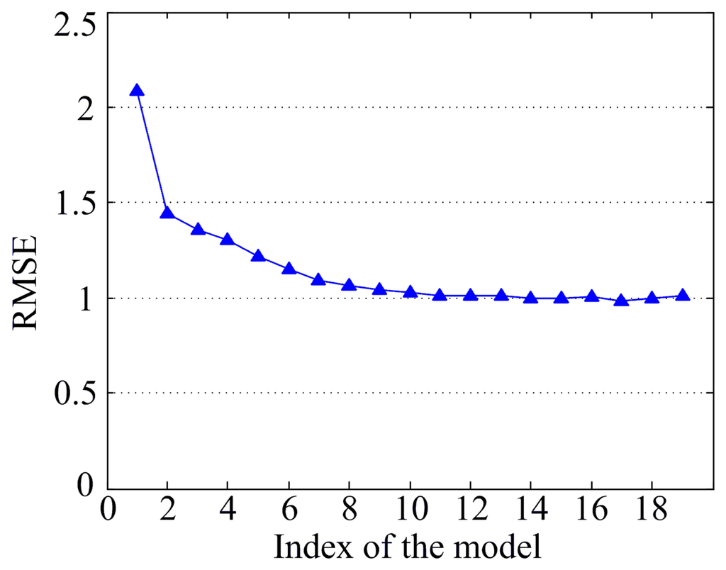 According to the order of the parameters shown in Table 2, the first 19 parameters are regarded as the input parameters of the model. The first model structure is 1:14:1, and the input parameter is the number 1 parameter. The second model structure is 2:14:1, and the input parameters are the first two parameters. By analogy, the nth model structure is n:14:1, and the input parameters are the first n parameters. Each model had 14 hidden nodes, and is trained 30 times with the same training data, and tested with the same test data. The average RMSE at 30 times is obtained, as shown in Figure 7.