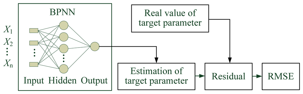 Figure 5 shows the modeling procedures based on a BPNN for estimating target parameters. Given one parameter in Table 1 as the target parameter of the BPNN, the other 19 parameters are considered as the inputs of the BPNN to be selected.