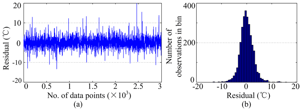 The model of the temperature of generator bearing B was analyzed with 3000 test data points obtained during normal operation. The residual of the model and its distribution are shown in Figure 9. As shown in Figure 9a, the errors were mostly found at approximately ±5 °C, and the RMSE was 2.6544. Through data processing, such as smooth filtering of data [12], errors can be effectively reduced. However, considering that a WT is a complex nonlinear system, a large residual does not signify an abnormal condition and data may contain useful information. Hence, research data were not processed in this study. According to Figure 9b, the residual distribution of the model agrees well with the Gaussian distribution. From a statistical perspective, the model accurately reflects actual changes in temperature of generator bearing B during normal operation.