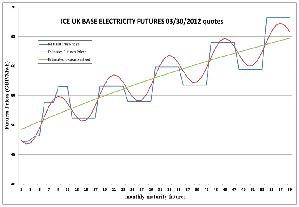 Figure 1 displays the futures prices actually observed on the last day of the sample (30 March 2012) along with those implied by our numerical estimates using all the contracts traded every day. We can estimate the spot electricity price for day t0 from the futures contract with the nearest maturity using Equation (3):