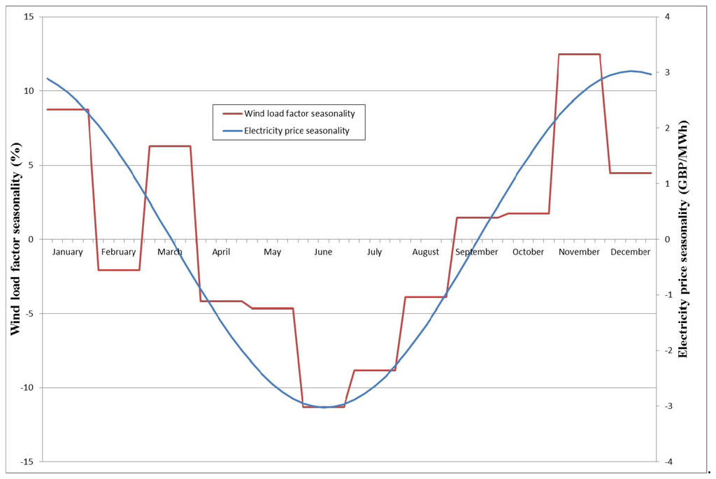 As Table 3 suggests, the periods with (statistically) highest wind generation fall in January and November. The highest prices of electricity are reached between October and March, so there is some overlapping. This time coincidence allows UK wind farm owners to obtain greater profitability from wind generation. Other papers overlook this feature [45], but our model takes it into account.