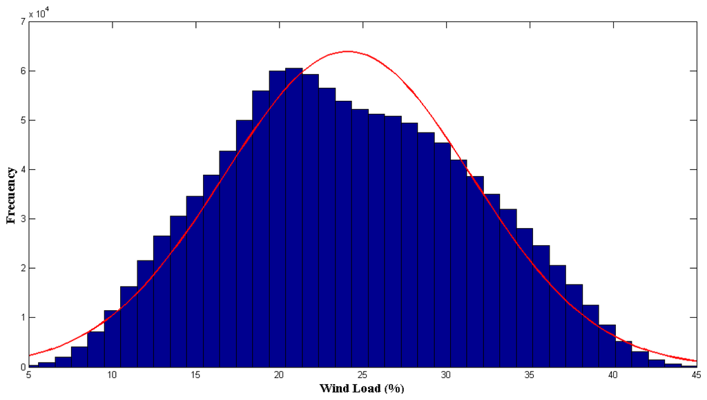 Empirical time series frequently show left skewness for average wind speeds: see for instance Morgan et al. [34]. Also, the distribution of wind power is usually considered to be skewed to the left. In this regard, we have run a number of simulations using the above parameter estimates. Figure 3 displays the resulting probability distribution of the load factor. The distribution shows this skewed pattern. This is so despite our assumption that the stochastic term is normally distributed. The deterministic component g(t) captures the expected monthly average seasonal behavior of the load factor in the UK.