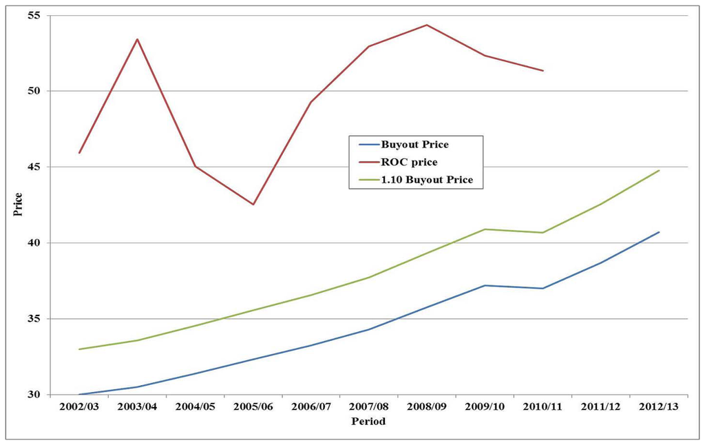 For each MWh of green electricity that a utility generates it receives one ROC [36]. If the utility generates more ROCs than needed to meet its obligation then it can sell the spare ROCs to other suppliers who are struggling to meet theirs via purchase agreements (it can also sell them at the quarterly auctions organized by the Non-Fossil Purchasing Agency, or through a broker for a fee). This allows them to receive a premium in addition to the wholesale electricity price. During the period 2002–2011 the proportion of the RO met by ROCs ranged from 56% to 76%. Those suppliers who do not have enough ROCs to cover their obligation must make a payment into the buy-out fund. This penalty or “buy-out price” is set every year in the same order that establishes the RO level: it is a fixed price per MWh shortfall at which Ofgem purchases ROCs (it is adjusted every year in line with the Retail Price Index). The buy-out price has risen from £30/MWh in 2002–2003 to £40.71/MWh in 2012–2013. The cash inflows to the buy-out fund are later aggregated annually and recycled as an extra reward on a pro-rata basis to electricity suppliers who surrendered ROCs. The total buy-out fund thus redistributed rose from £90 M in 2002–2003 to £357 M in 2010–2011.