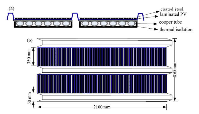 A pre-coated steel sheet is folded using a CNC folder in the form of a troughed roof profile. As depicted in Figure 1, a rough PVT evaporator prototype with a rated power of 200 Wp was developed as a supporting structure, with multi-port cooper tubes adhered to the rear as thermal absorber, and polystyrene (PS) foam laid beneath as insulator.