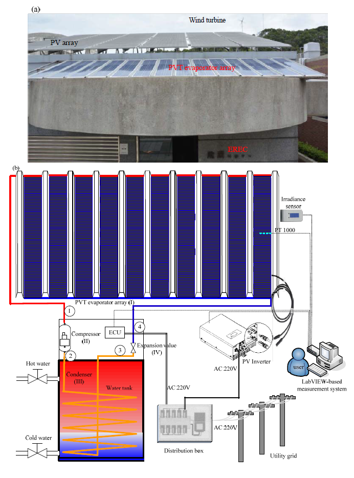 The utility model patent of the novel PVTA-HPWH system was issued 21 June 2013 in Taiwan [19]. A rooftop PVT evaporator integrated with a commercial HPWH system was implemented for evaluating the performance of the PVT device and the COP of the HPWH system.