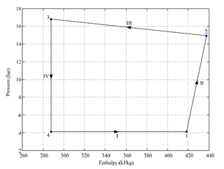 Figure 4 depicts the corresponding pressure-enthalpy chart. The PVT evaporator array consists of five rooftop PVT modules that are connected electrically in series and their refrigerant tubes are connected in parallel in the form of an external manifold. While flowing through the PVT evaporator (I), the refrigerant is directly vaporized.