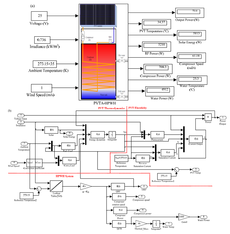 Based on the mathematical formulation of PVTA-HPWH system, a simulation model is built in the MATLAB/Simulink environment. The proposed PVTA-HPWH model having direct interaction of PV electricity with the thermodynamics is built. First, the overall PVTA-HPWH system is decomposed into the PVT evaporator and HPWT subsystems that are created as subsystem blocks. The PVTA-HPWH block is masked with a user-friendly icon as shown in Figure 5a. Then the block diagram of the subsystem is built to mathematically characterize both the thermodynamics and electricity of the PVT evaporator and HPWH system as shown in Figure 5b.