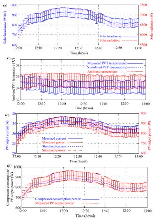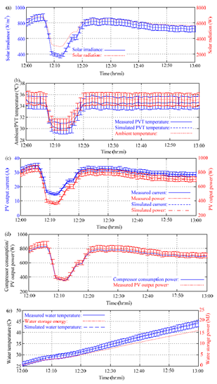 From above analysis, it is seen that the proposed PVTA-HPWH model has a sufficient degree of accuracy under real sunny and mostly sunshine weather conditions. Even in face of the fluctuations of weather conditions, the model confidence is enough to predict the operation situations of overall PVTA-HPWH system. It should be noted that the proposed model slightly underestimates the output current and power posed to the overestimation of PVT temperature.