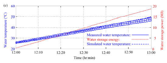 For easy comparison, the measured and simulated operating temperatures of PVT module are shown in Figure 6b. The results reveal that temperature difference is less than ±0.35 °C and its root mean square (RMS) value is 0.1339 °C. Considering the ±0.8 °C accuracy (in the range of −40 °C to 100 °C) of the PT1000 sensor, the prediction accuracy of PVT temperature is ±1.15 °C. Therefore, the simulated and measured results of the output current and power the PVT collector are almost close to each other as represented in Figure 6c. The maximal difference between the measured and simulated output current is 0.3 A and the RMS of difference is 0.1076 A. In addition, the maximal difference between the measured and simulated output power is 1.2 W and the associated RMS is 0.6305 W. Figure 6d shows the power consumption of the compressor of HPWH system and the result reveals PV electricity is enough to afford the compressor operation. The water temperature and energy in the water tank are depicted in Figure 6e. The results of the difference and RMS analyses are listed in Table 6.