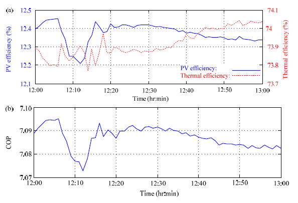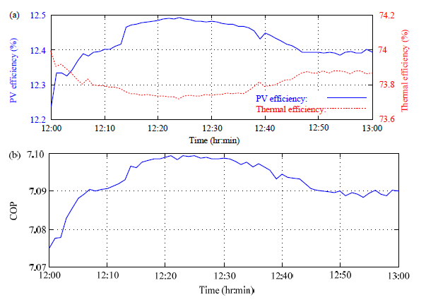 The solar electricity efficiency is in the range of 12.2%–12.5% with an average of 12.37% and the solar thermal efficiency is in the range of 73.70%–74.00% with an average of 73.90%. The total efficiency of the PVT device is in the range of 86.0%–86.5% with an average of 86.29%. On the other hand, the COP of the integrated PVTA-HPWH system is in the range of 7.07–7.10 with an average of 7.09. It should be pointed out that the fluctuation of solar irradiance does have a negative effect on the efficiency of the PVT device and the COP of PVTA-HPWH system. The mean results of both PVT efficiency and overall COP are also listed in Table 7.