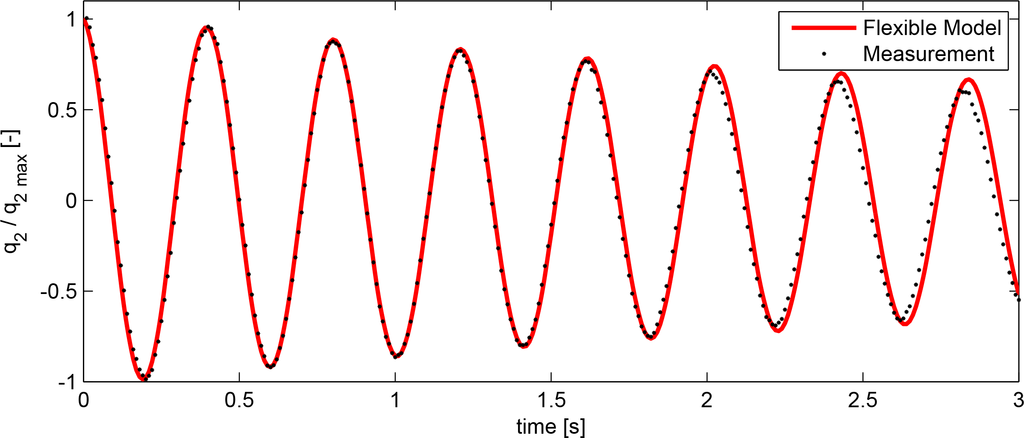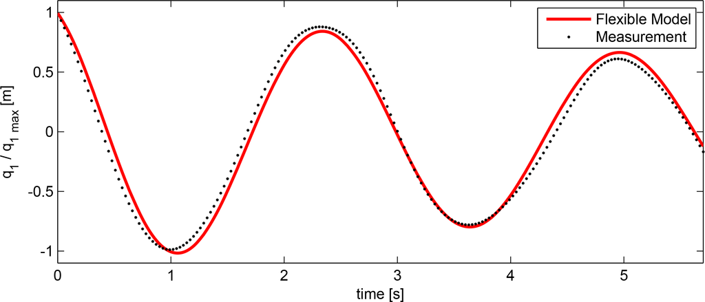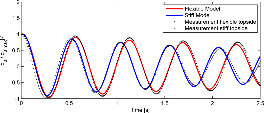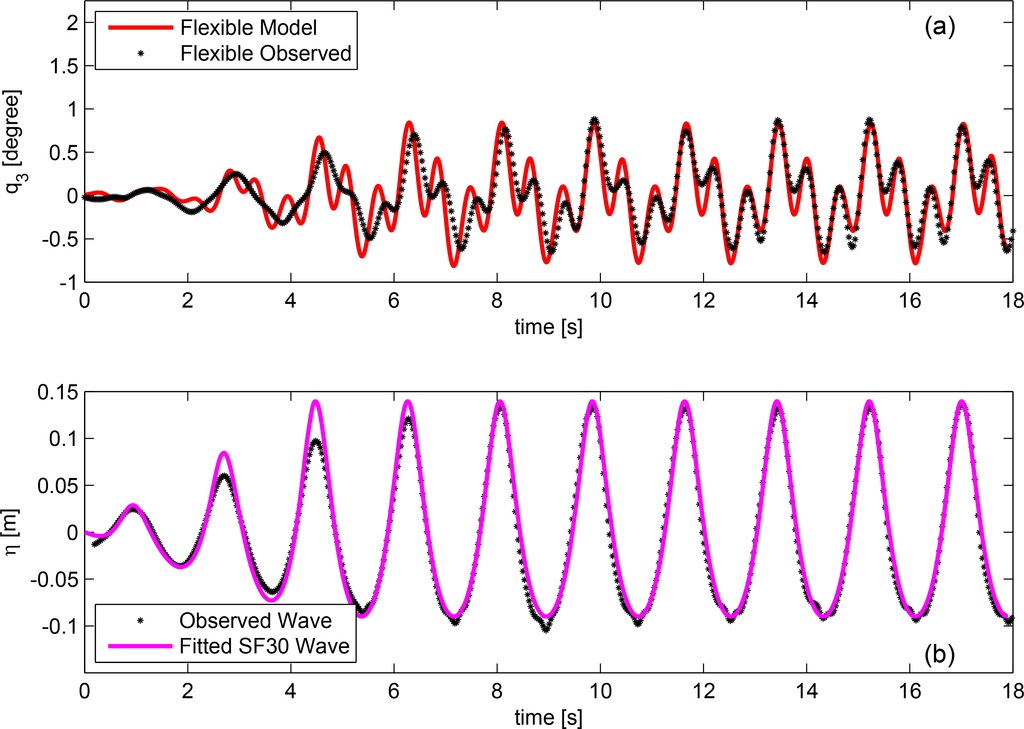 Once a qualitative analysis of the hybrid model’s capability was complete, the hybrid model was validated against experimental data. As previously mentioned, two different structural stiffness configurations form the basis of comparison, namely the stiff and flexible model [6]. The response will be evaluated in TB, as defined in Figure 2. TB has been selected as the point of comparison due to sensor location in the experimental setup. Consequently, only a single transformation from CoG to TB within the numerical model is required.