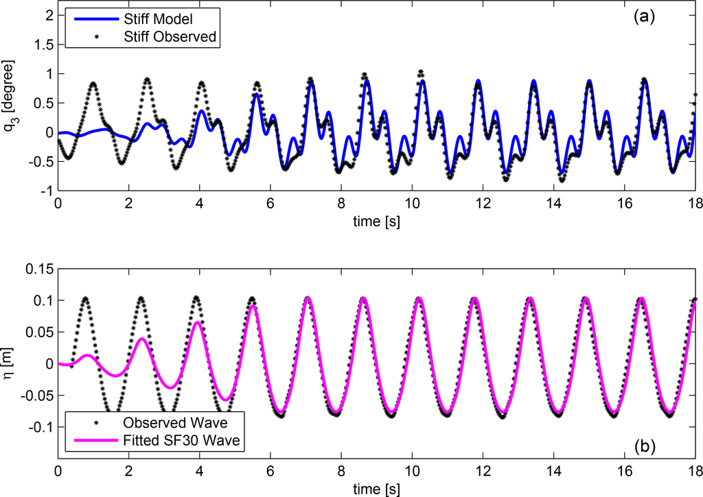 The radiation force is the load exerted by the moving body in otherwise calm water. The total radiation load is composed of a part proportional to the acceleration of the body (added mass) and a part proportional to the velocity (radiation damping) of it. The time domain model is represented by the so-called fluid memory terms (IRF) and the matrix of added mass at infinite frequency. This term is related to the convergence of the integral, as detailed in [9]. Although the same convolution approach can be used to evaluate the radiation force vector (Frad), it benefits the implementation to approximate the frequency response function by a system of first order ODEs. As presented in [9,10], a fifth or lower order system is enough to model a smooth response, as for the presented structure. The state space approximation of the radiation problem is obtained from a least squares fit of the radiation frequency response function. The freeware marine toolbox has been used for this purpose [10]. The selected model order is three.