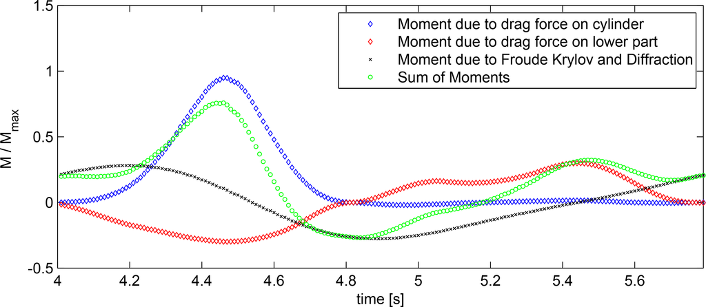 To obtain a better understanding of the force contributions, the pitch excitation moment was split into its single components for one period; see Figure 12. It is obvious that the horizontal drag force acting on the cylinder is the dominating load, i.e., the combined total moment is dominated by the kinematics above the still water level impacting on the surface piercing part. The overturning moment is much larger than the moment induced by the loads acting on the lower part of the structure. The latter is, in fact, opposite, as the horizontal velocities are acting below the point of rotation. The diffractive part of the moment dominates the negative peak when the horizontal velocity components of the wave kinematics are close to zero. Hence, neither a pure potential flow approach nor a pure viscous force approach would be able to deliver the same degree of fit.