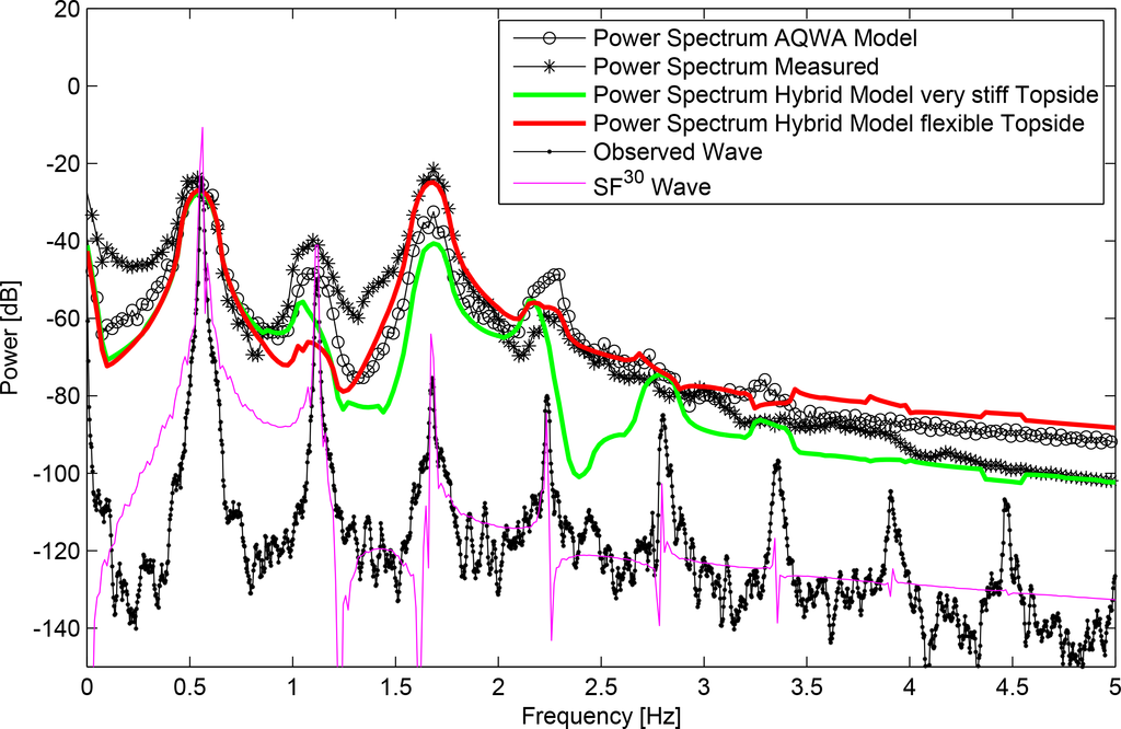 The hybrid model performs well when looking at the power spectra of the pitch decay responses; see Figure 13. Only a minor deviation is found for the very stiff model compared to the ANSYS AQWA response. For the regular wave pitch response spectra, the results are two-fold; see Figure 14. It becomes clear that the stream function wave cannot fully reproduce the laboratory waves, and in particular, the very high frequency components are underestimated. However, the influence on the structural response is negligible. The third order component is close to the pitch eigenfrequency of all structural layouts, and consequently, the dynamic amplification due to the flexibility of the topside becomes evident. The hybrid model matches the observed pitch response, whereas the very stiff model matches the results from the ANSYS AQWA model. Room for improvement can be found at the second order component; unlike the ANSYS AQWA model, the hybrid model lacks the inclusion of the second order sum frequency excitation force, explaining why both the flexible and very stiff models underestimate the responses, while the ANSYS AQWA model shows a better match.