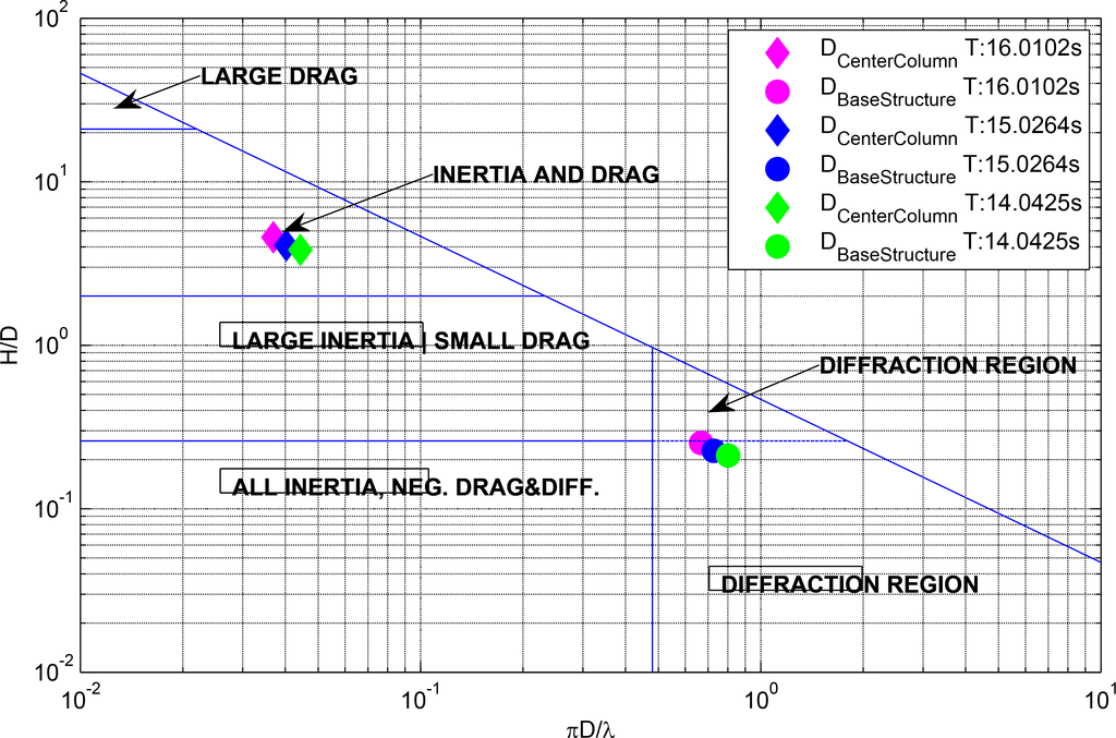 The model will be based on a boundary integral equation method (BIEM) solution with additional hydrodynamic viscous drag terms according to Morison’s equation. This approach is believed to be more time efficient than complex numerical techniques, e.g., computational fluid dynamics. The need for an extra dissipative term related to viscous effects in the boundary layer is supported by the results of a non-dimensional analysis of the structure. Figure 3 shows that, based on the non-dimensional ratio between inertial and viscous loads, the flow regime changes along the vertical axis of the structure, and consequently, the use of BIEM plus a viscous drag term becomes necessary. Hence, the wave-body interaction is decomposed into four contributions: