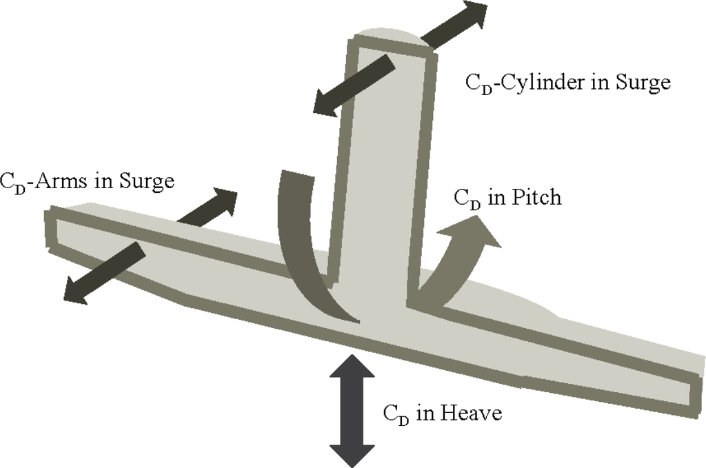 Table 2 shows the applied drag coefficients. A KC relationship for the CD in pitch was iteratively fitted and resulted in values similar to the ones in heave. The drag coefficient values for the projected area of the arms were iteratively fitted, as well. It is obvious that the CD approximations for the lower part of the structure have been tailored to the structural layout and the respective assumptions. The estimated CD value for the surface piercing cylinder in the surge direction, as well as the CD in the heave and pitch direction agree well with values that can be found in the literature [14,16].