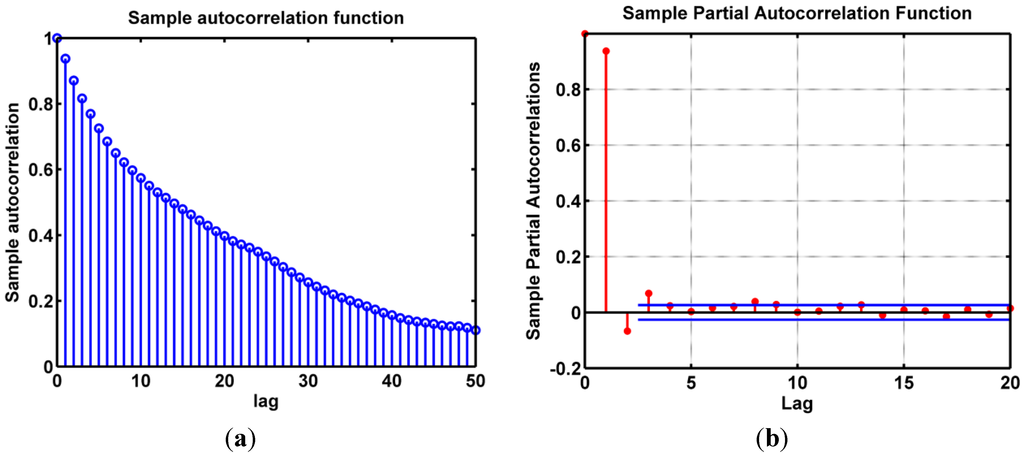 Autocorrelation function (a) and partial autocorrelation function (b) plots for the wind power Pm.