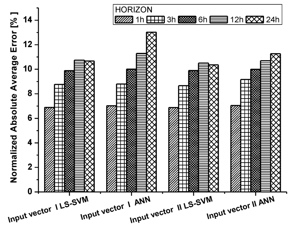 Five forecast horizons (1 h, 3 h, 6 h, 12 h, 24 h) were considered. For each hour “i” considered as the beginning time of the forecasting, the input vector was given by: